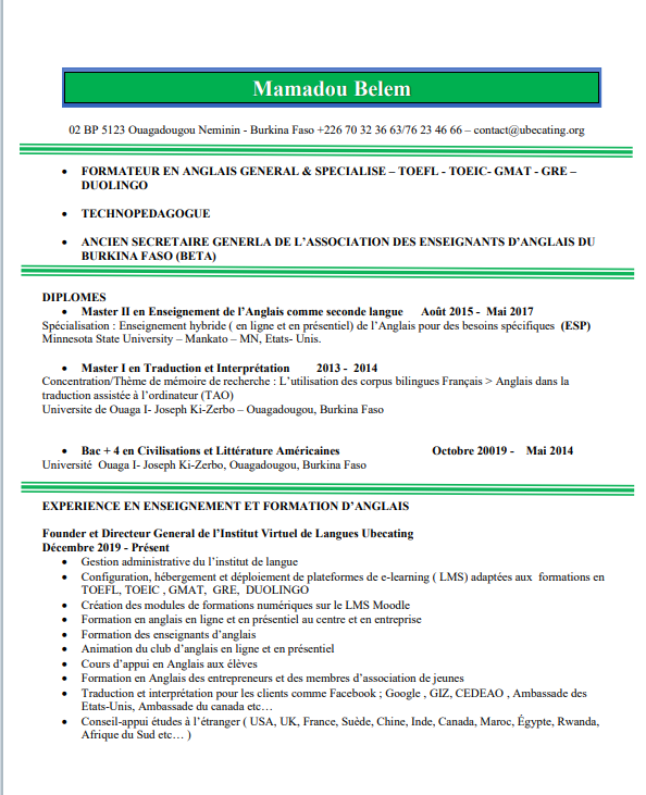 BELEM Mamadou, le promoteur de l’Institut Virtuel de Langues UBECATING où il dirige des cours en groupe et propose un coaching individuel aux apprenants. Parmi mes étudiant(e)s figurent ceux et celles qui envisagent de passer les tests d'anglais TOEFL, TOEIC ou Duolingo dans le cadre des conditions d'admission dans les universités américaines. Il s'engage à faire en sorte qu'ils respectent leurs exigences et leurs délais de test, ce qui implique souvent de travailler avec eux de façon individualisée et intensive. En plus de cela, il a plus de 10 ans d'expérience dans la traduction et l'interprétation. Il offre également des services d'accompagnement pour les études aux Etats-Unis, Canada, Chine, Europe etc...